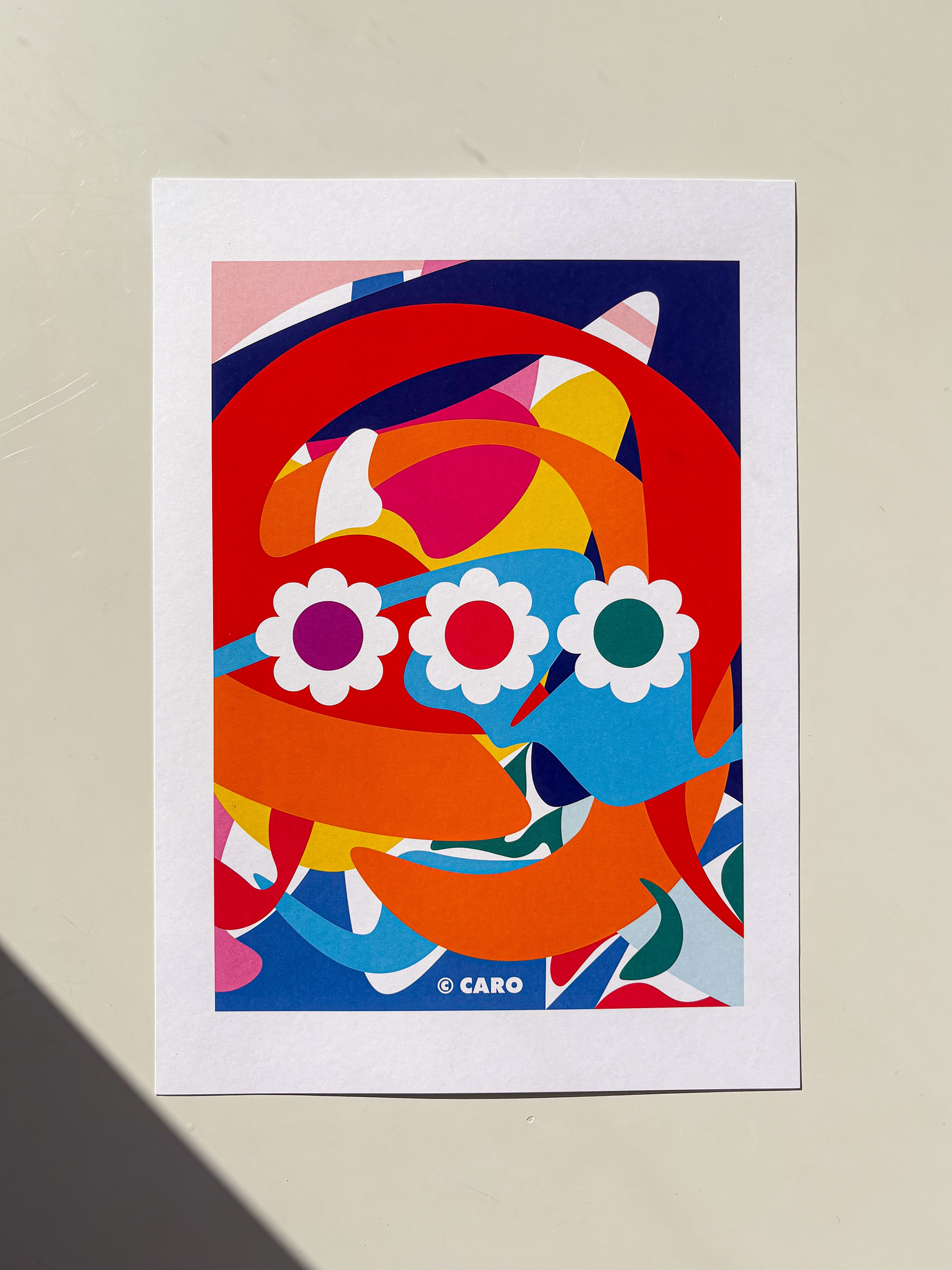 Digital illustration of 3 Daisy flowers being surrounded by curvy and colourful shapes. Drawn on Adobe Photoshop Express® and Illustrator®, 2023.