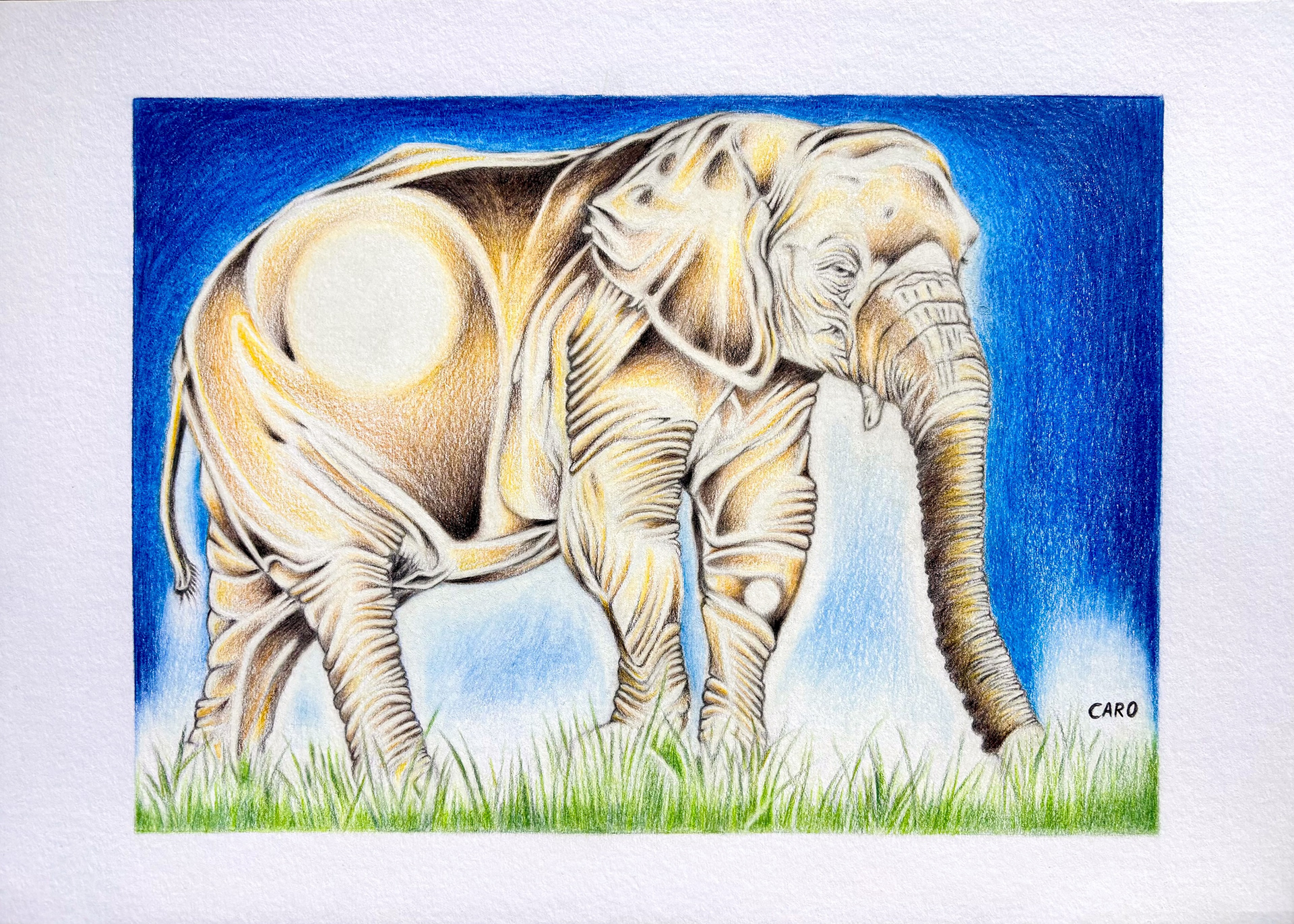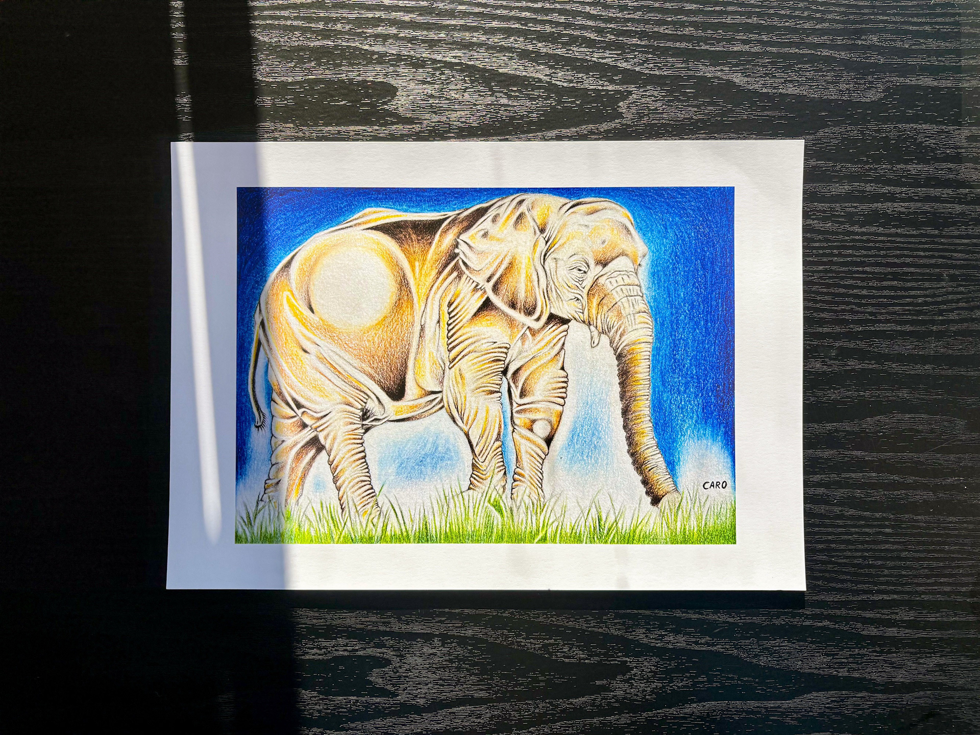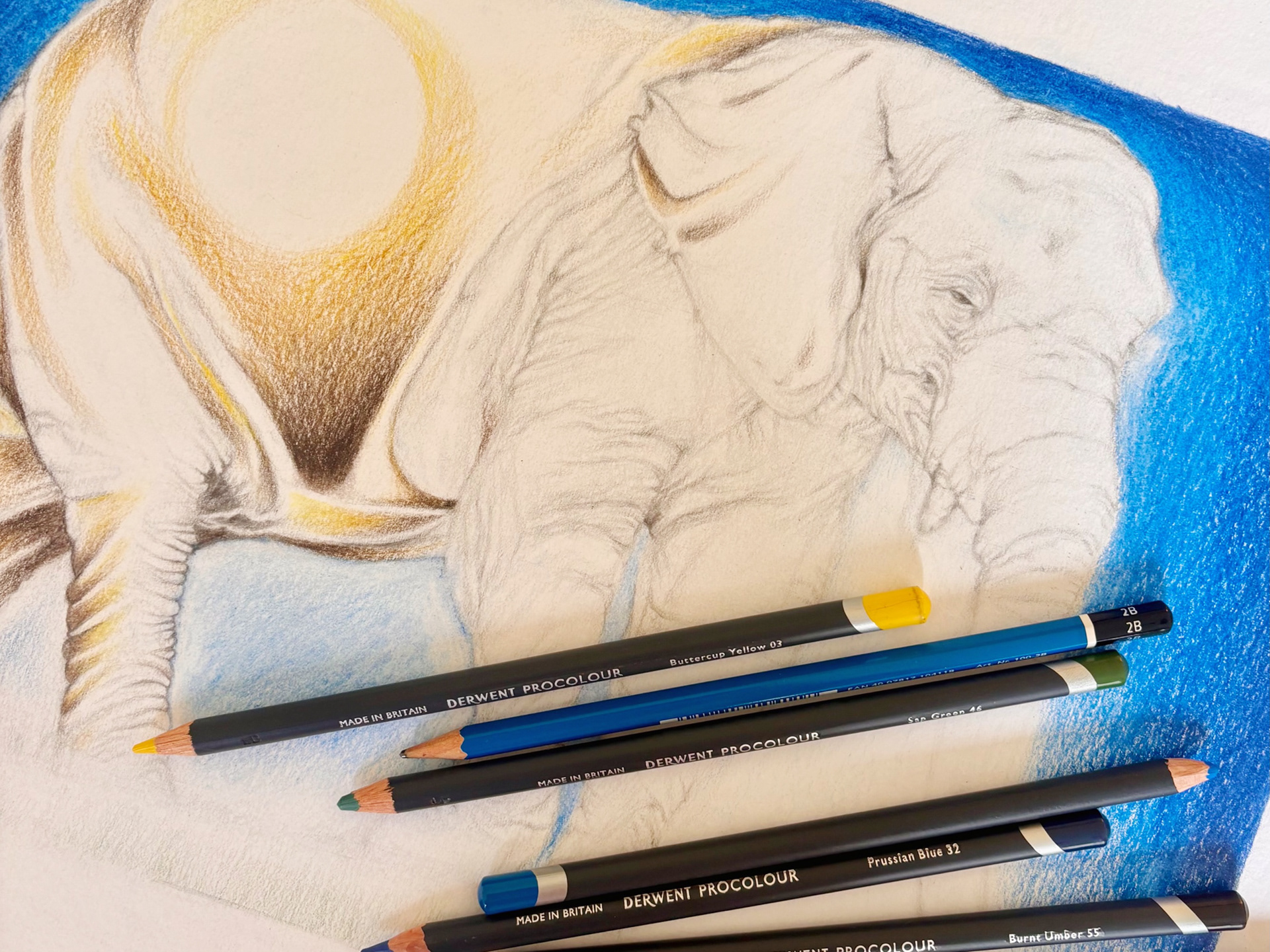 Drawing of an elephant. Graphite, Derwent® Procolour pencils and Conte à Paris pastel, 42 x 29.7cm, 2025. Also printed on 230gsm Enhanced Smooth Matte Paper. Original photo reference: Josef Svoboda and Vecteezy.com.