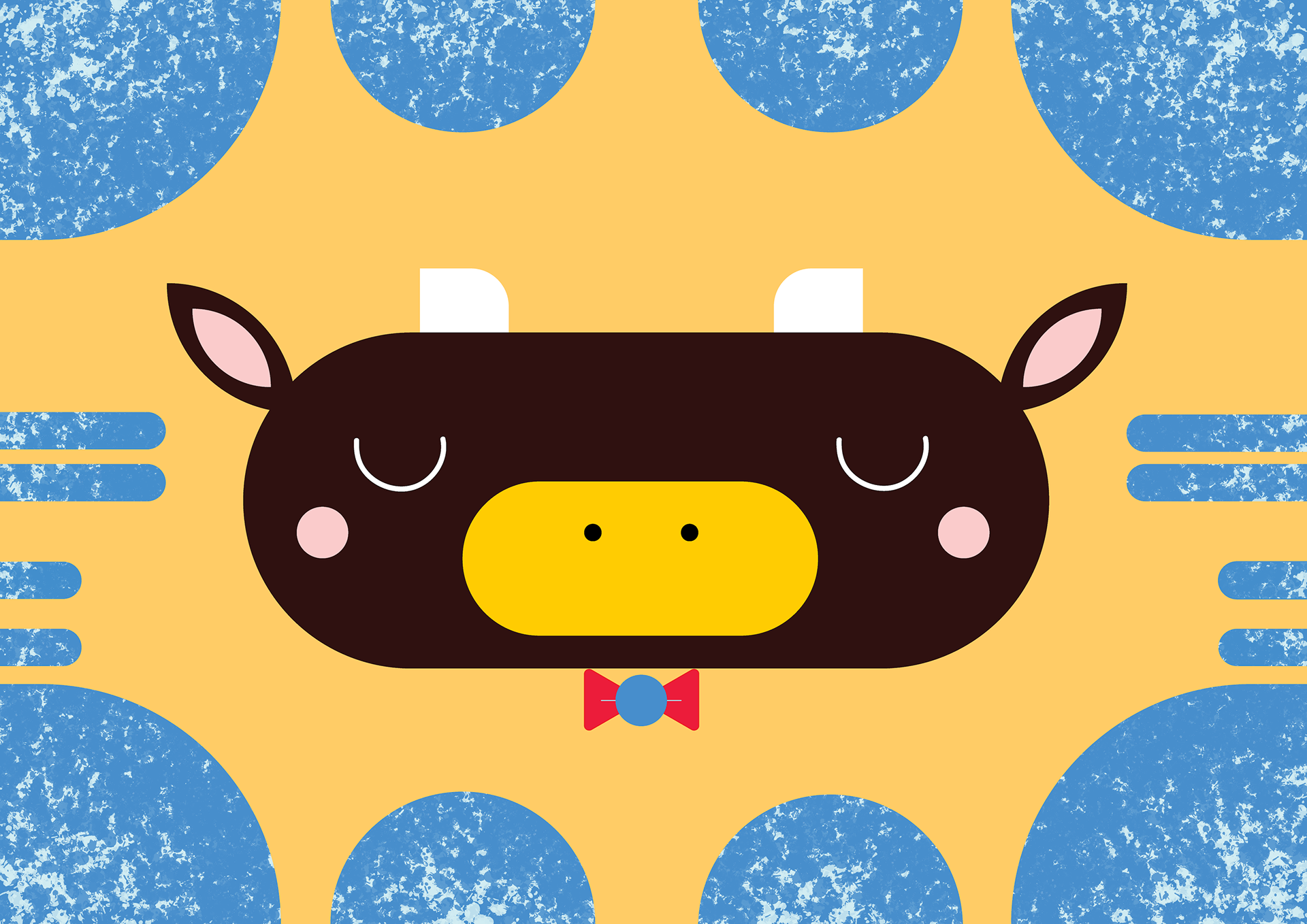 Digital illustration of a bull being surrounded by colourful and lively shapes. Drawn on Adobe Illustrator® between 2022 and 2023. Printed on 220gsm decor art etching paper, 6 x 8 inches.