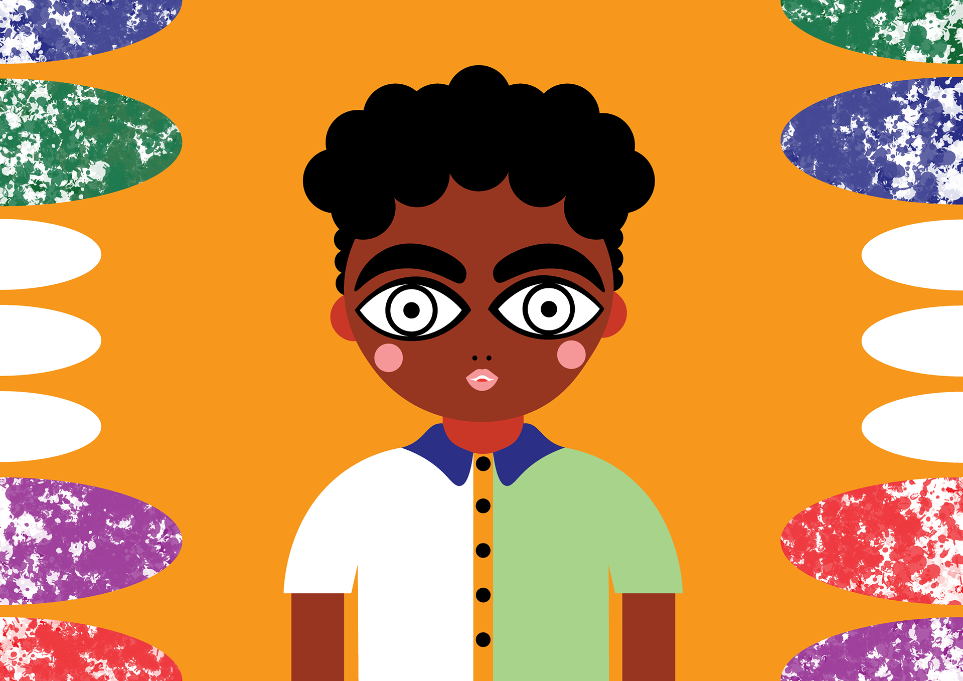 A digital illustration of a little boy being surrounded by both colourful and geometric shapes. Drawn on Adobe Illustrator®, 2023.