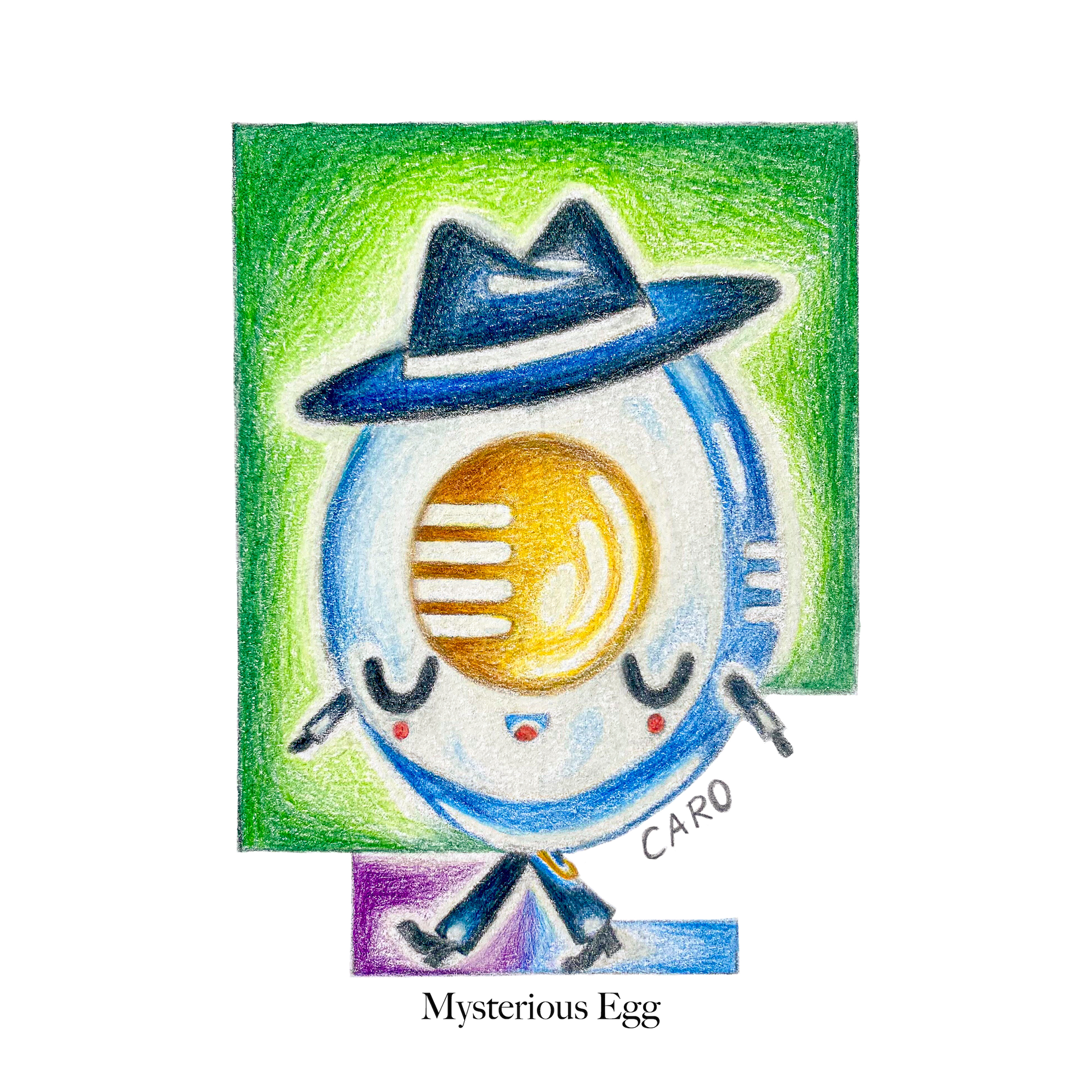Pencil cartoon illustration of an egg walking through the night. Drawn in 2024 with Reeves® graphite, Derwent® coloured pencils on Fabriano® 300gsm art paper, 17.78 x 12.7 cm. Digitally rendered on Adobe Photoshop Express® and Illustrator®.