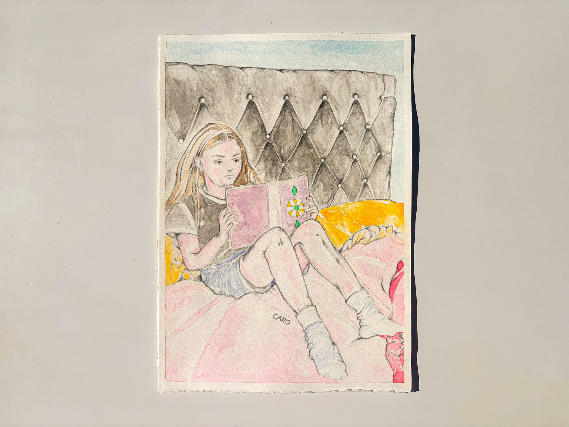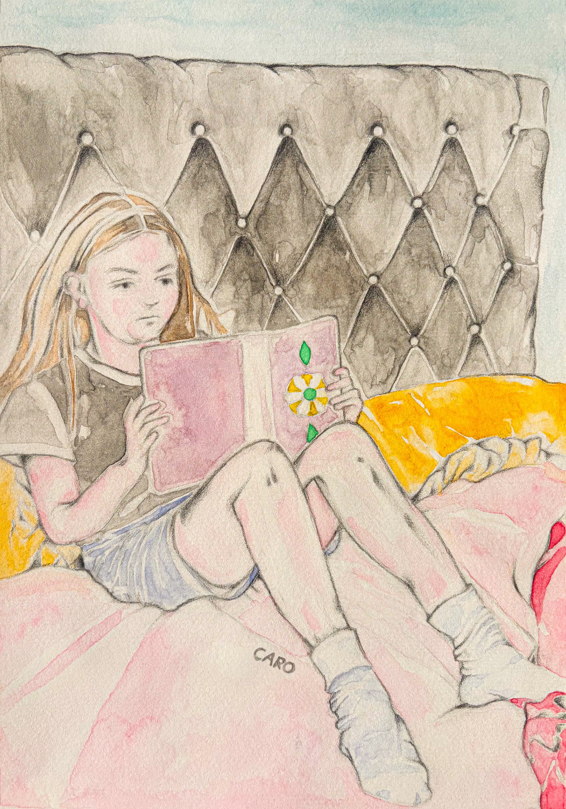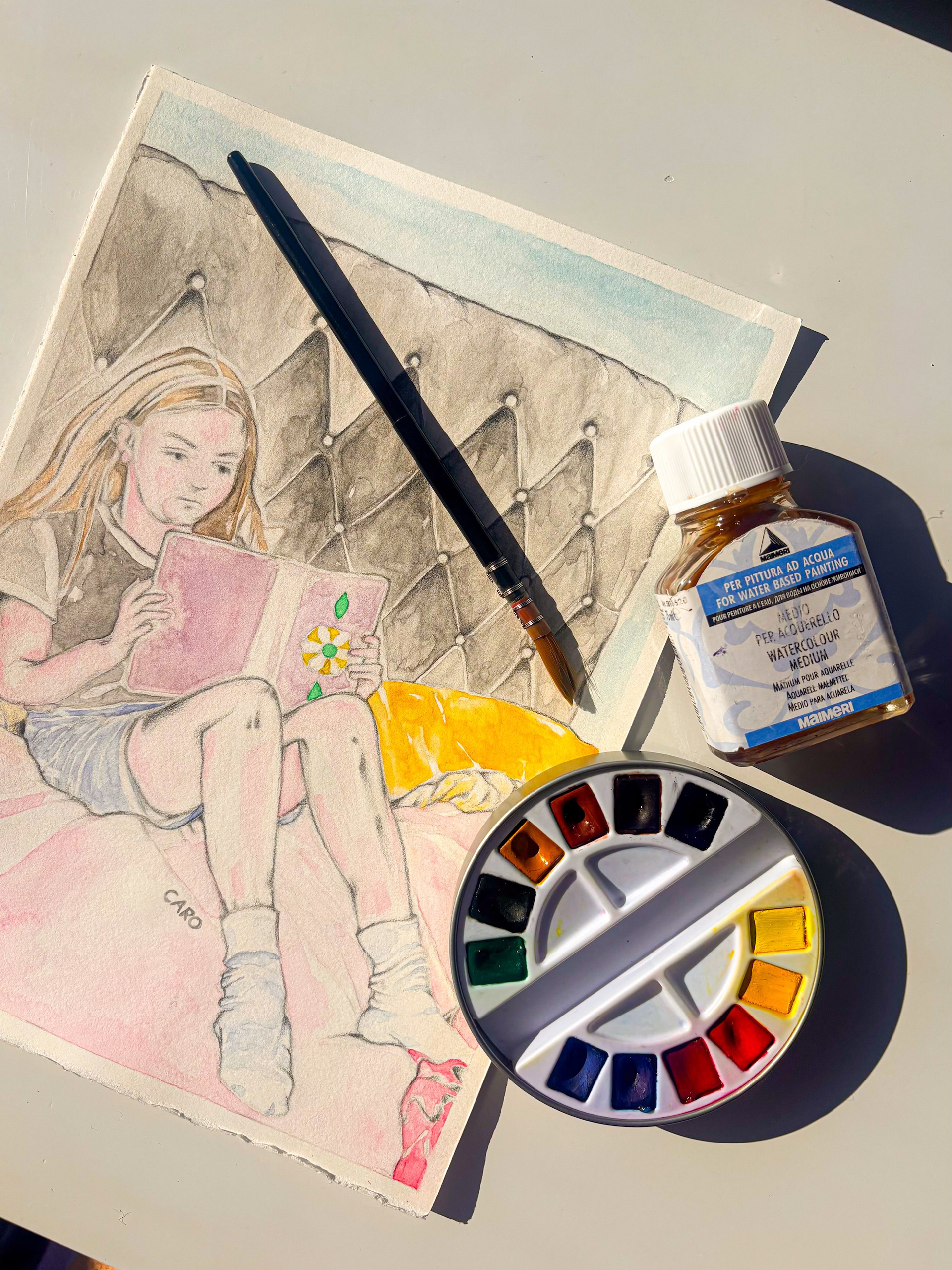 Mixed media portrait drawing. Pebeo® watercolours, Maimeri® medium and graphite on Fabriano® 300gsm art paper, 21 x 29.7 cm, 2025.