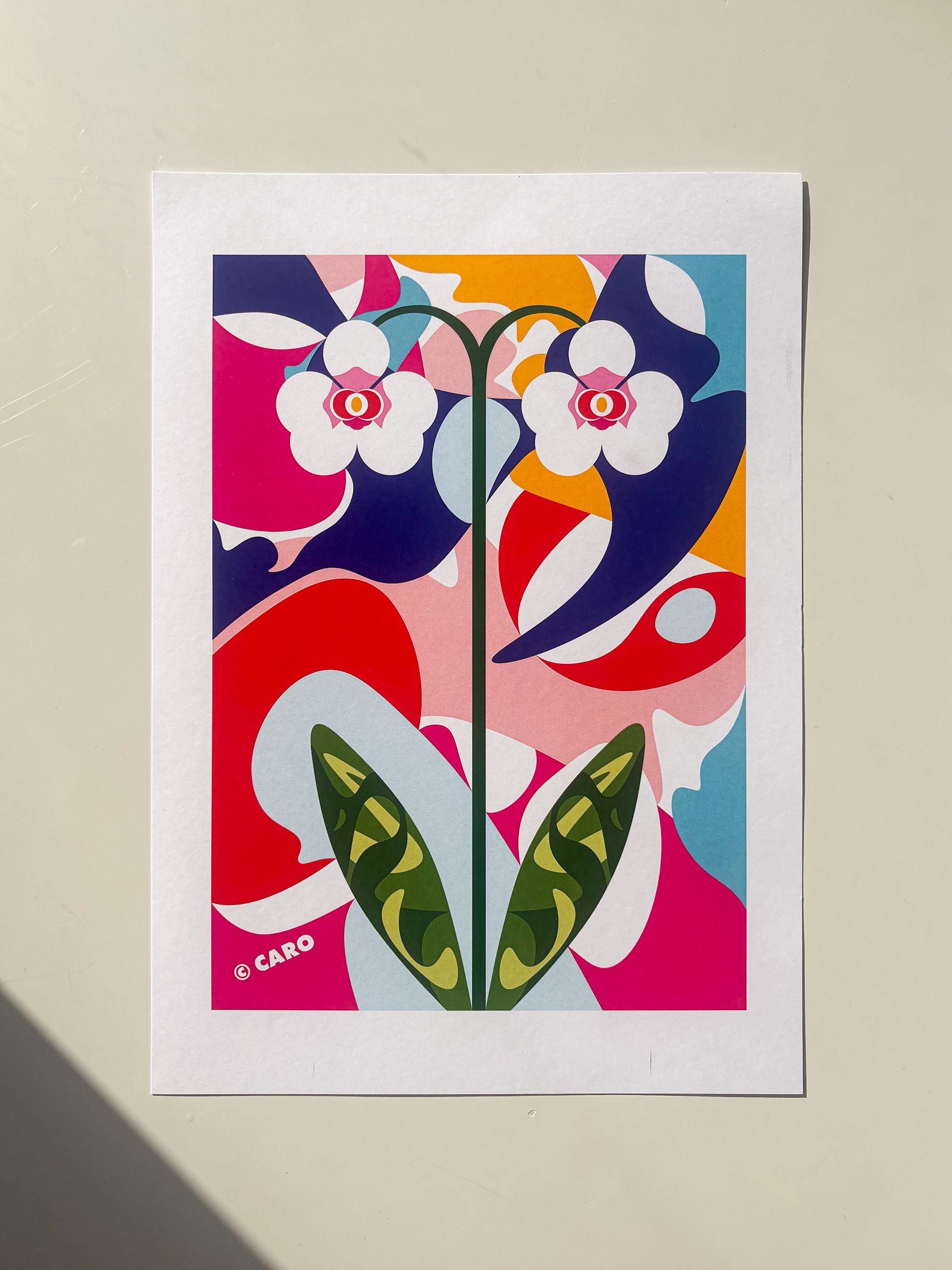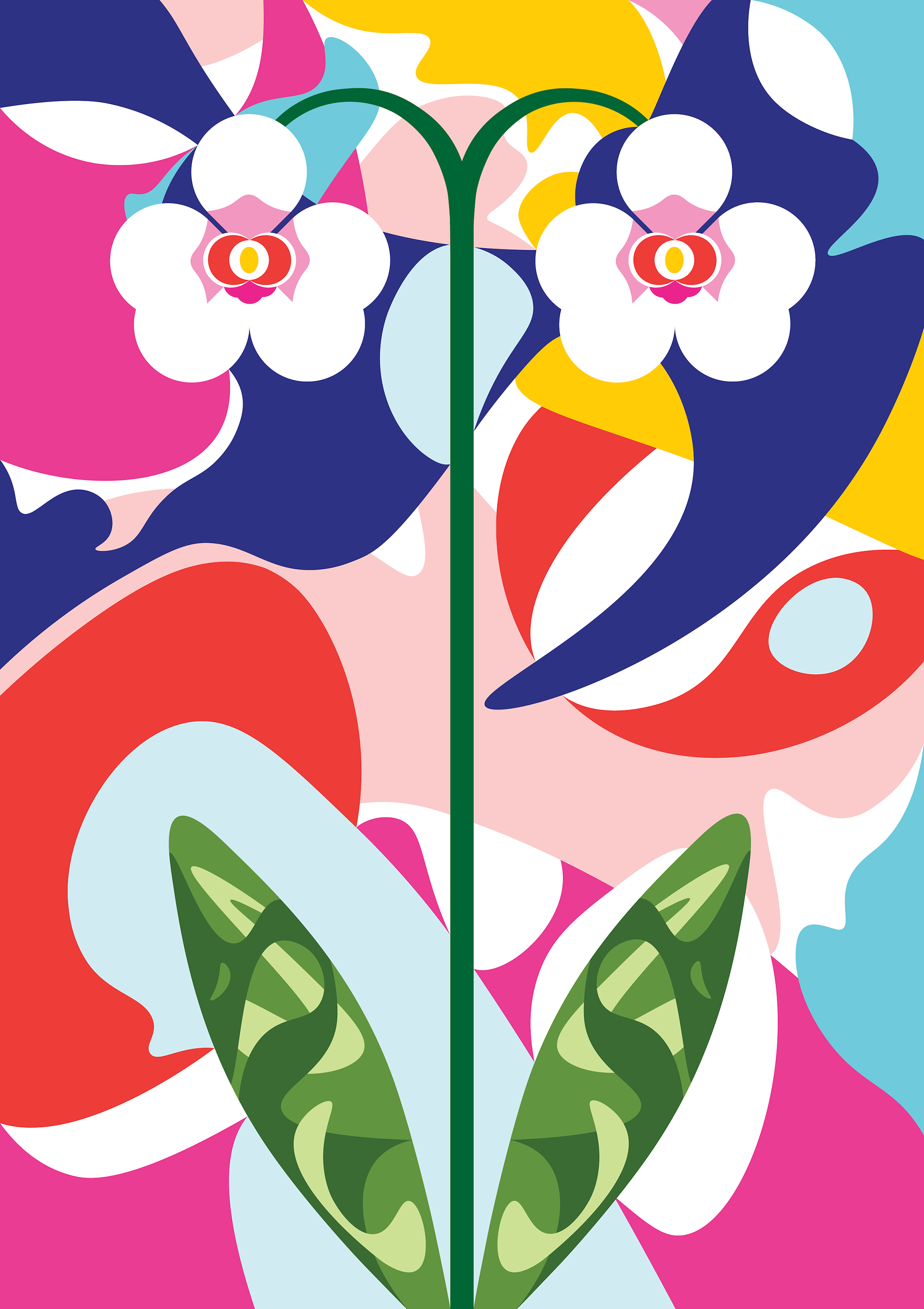 Digital illustration of an orchid flower being surrounded by curvy and colourful shapes. Drawn on Adobe Photoshop Express® and Illustrator®, 2023.