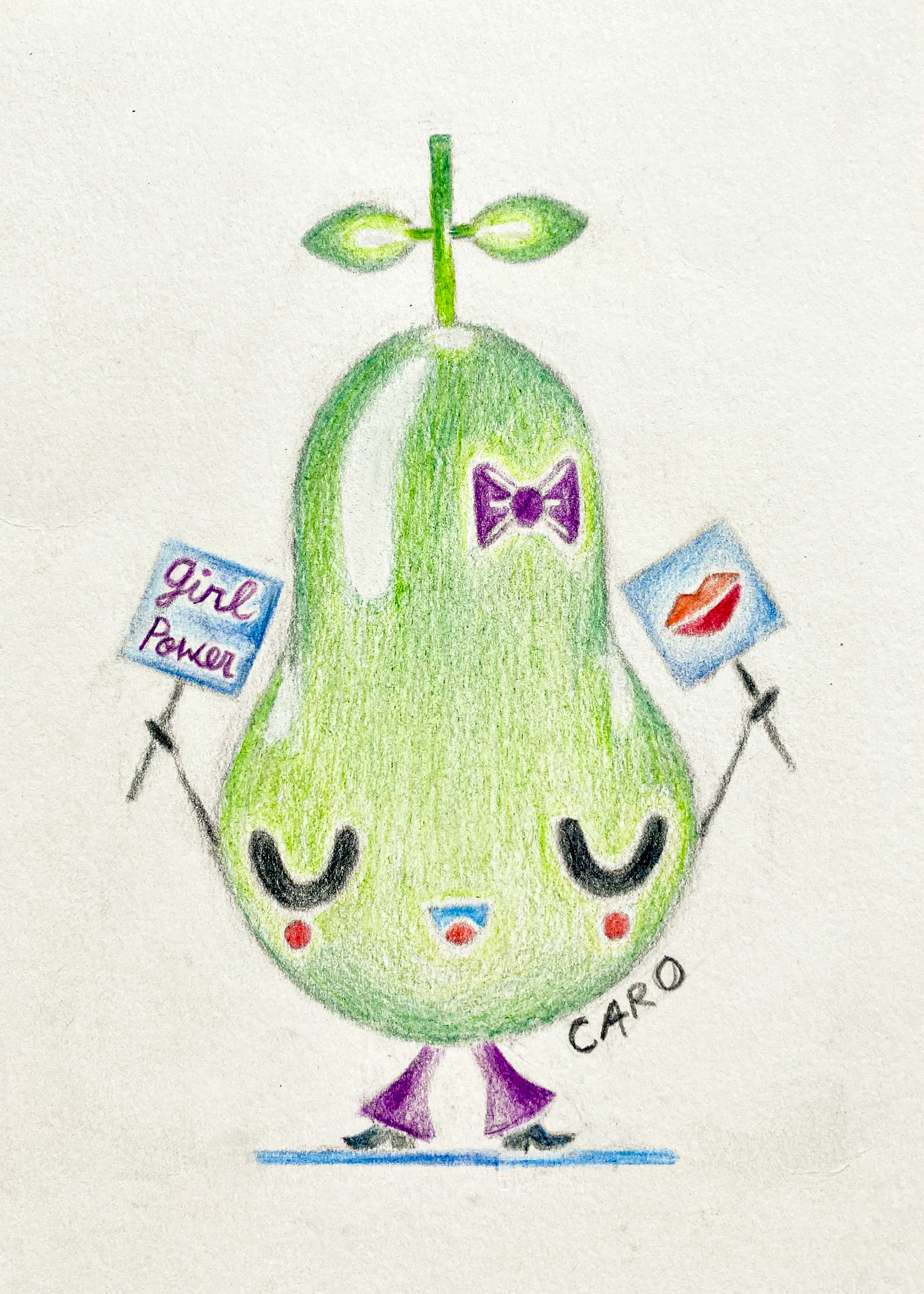 Pencil cartoon illustration of a pear. Drawn in 2023 with Reeves® graphite, Derwent® coloured pencils on Fabriano® 300gsm art paper, 17.78 x 12.7 cm. Digitally rendered on Adobe Photoshop Express® and Illustrator®.
