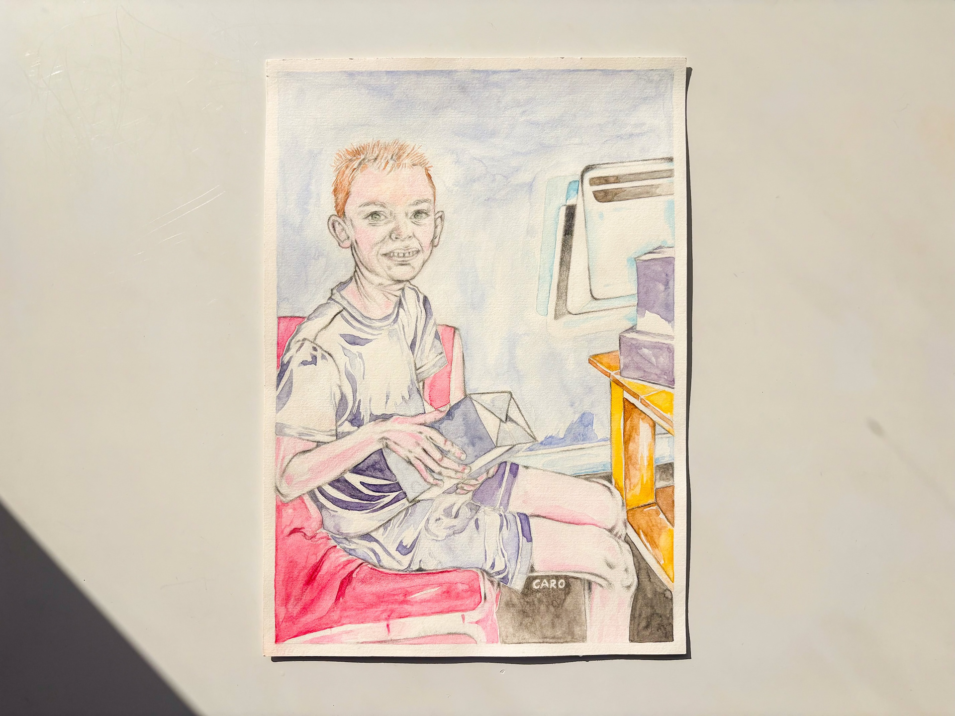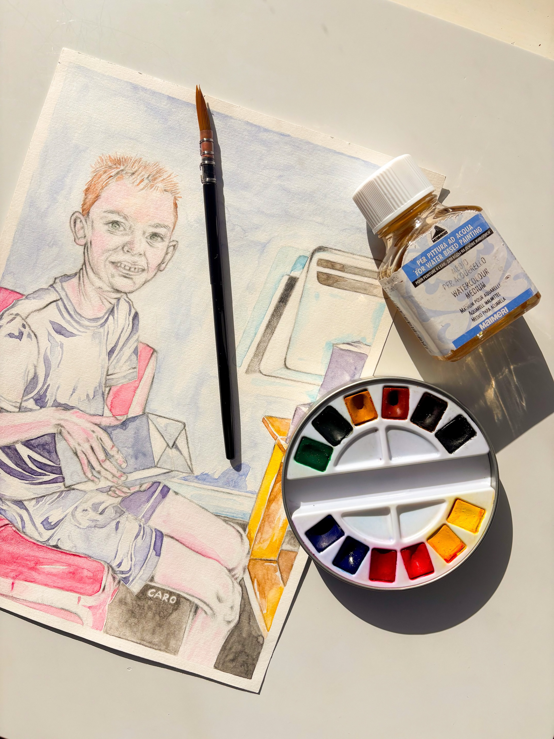 Mixed media portrait drawing. Pebeo® watercolours, Maimeri® medium and graphite on Fabriano® 300gsm art paper, 21 x 29.7 cm, 2025.