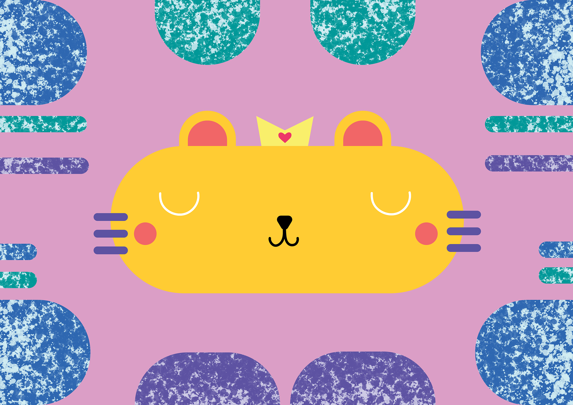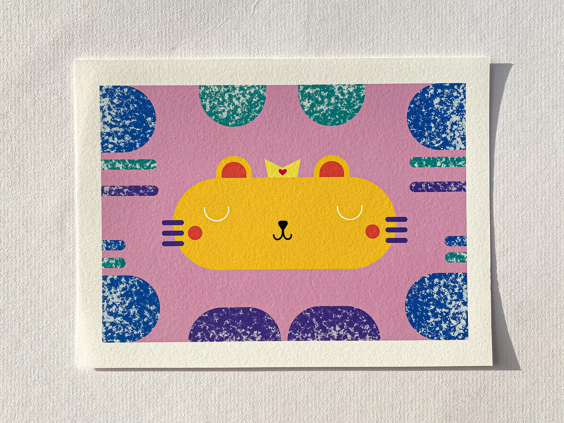 Digital illustration of a lioness being surrounded by colourful and lively shapes. Drawn on Adobe Illustrator®, 2022. Printed on 220gsm decor art etching paper, 6 x 8 inches.