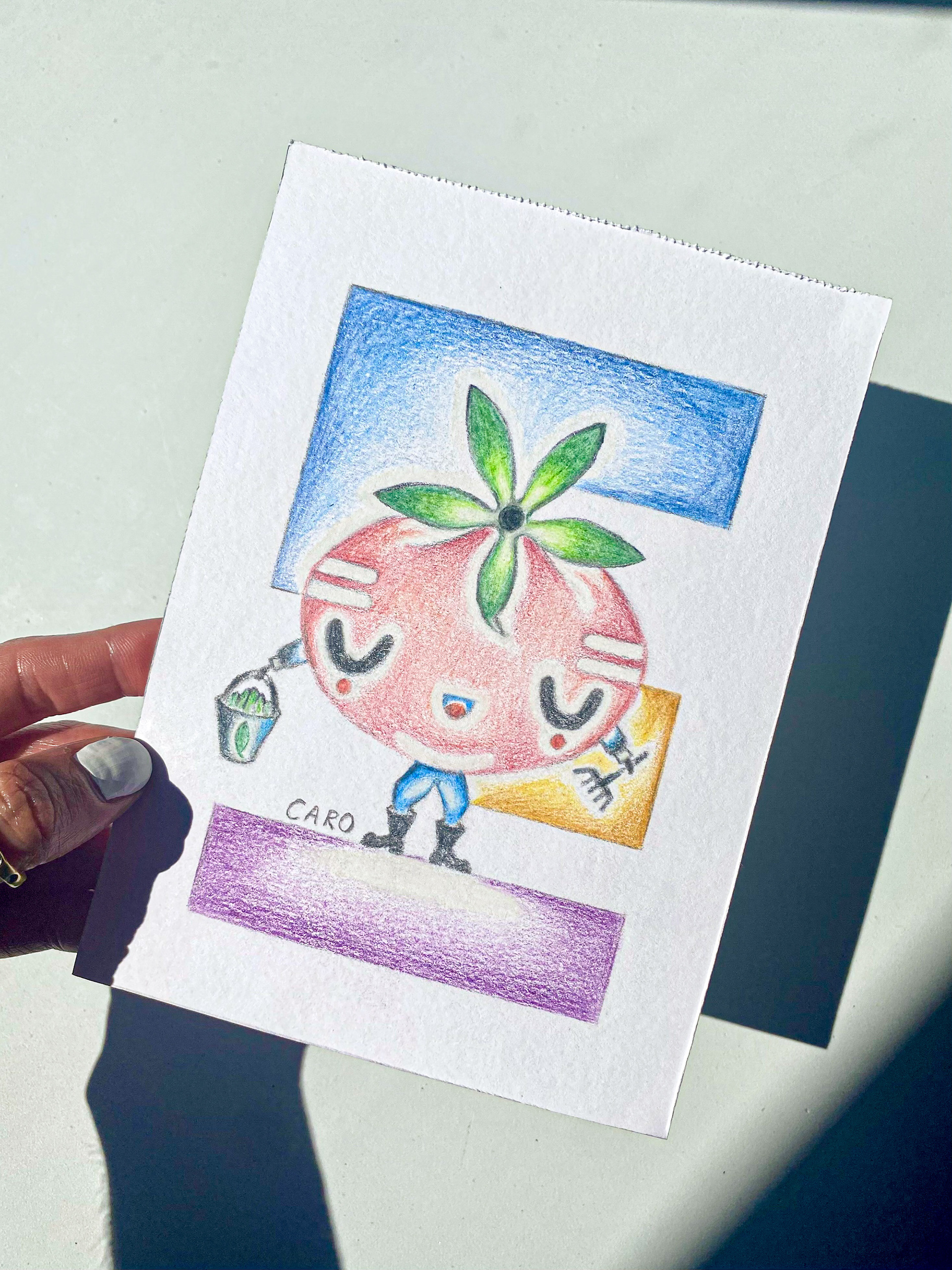 Pencil cartoon illustration of a tomato working on a farm. Drawn in 2024 with Reeves® graphite, Derwent® coloured pencils on Fabriano® 300gsm art paper, 17.78 x 12.7 cm. Digitally rendered on Adobe Photoshop Express® and Illustrator®.