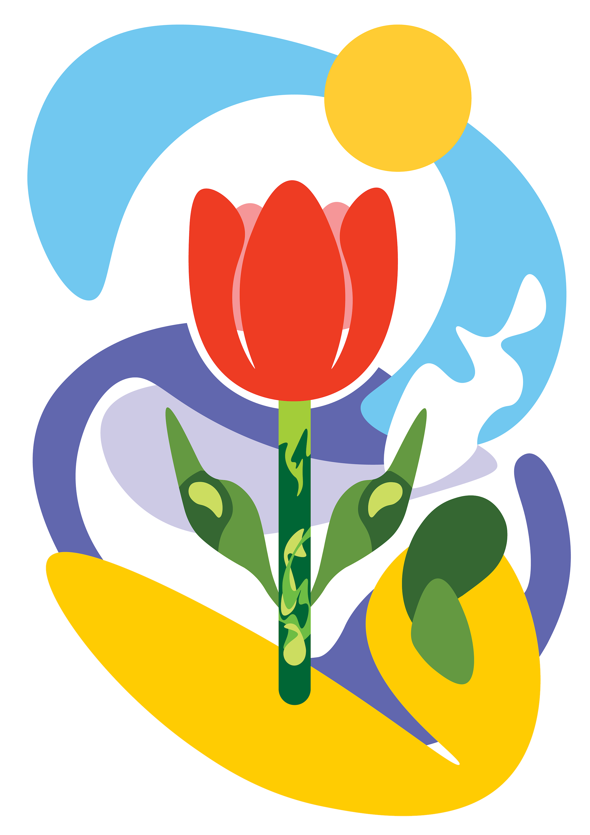 Digital illustration of a tulip flower being surrounded by curvy and colourful shapes. Drawn on Adobe Photoshop Express® and Illustrator®, 2023.