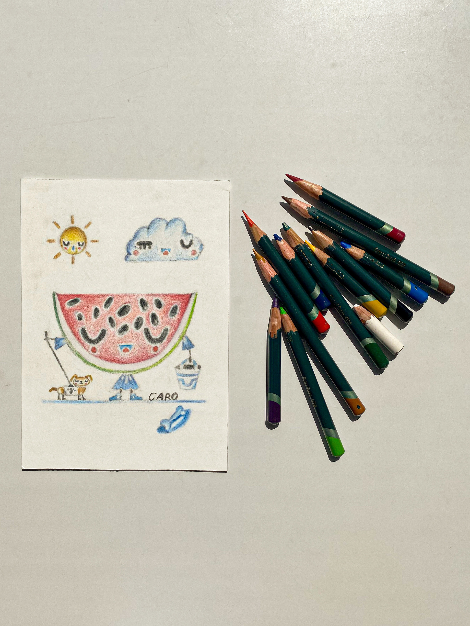 Pencil cartoon illustration of a watercolour walking her dog and having a day outdoors. Drawn in 2023 with Reeves® graphite, Derwent® coloured pencils on Fabriano® 300gsm art paper, 17.78 x 12.7 cm. Digitally rendered on Adobe Photoshop Express® and Illustrator®.