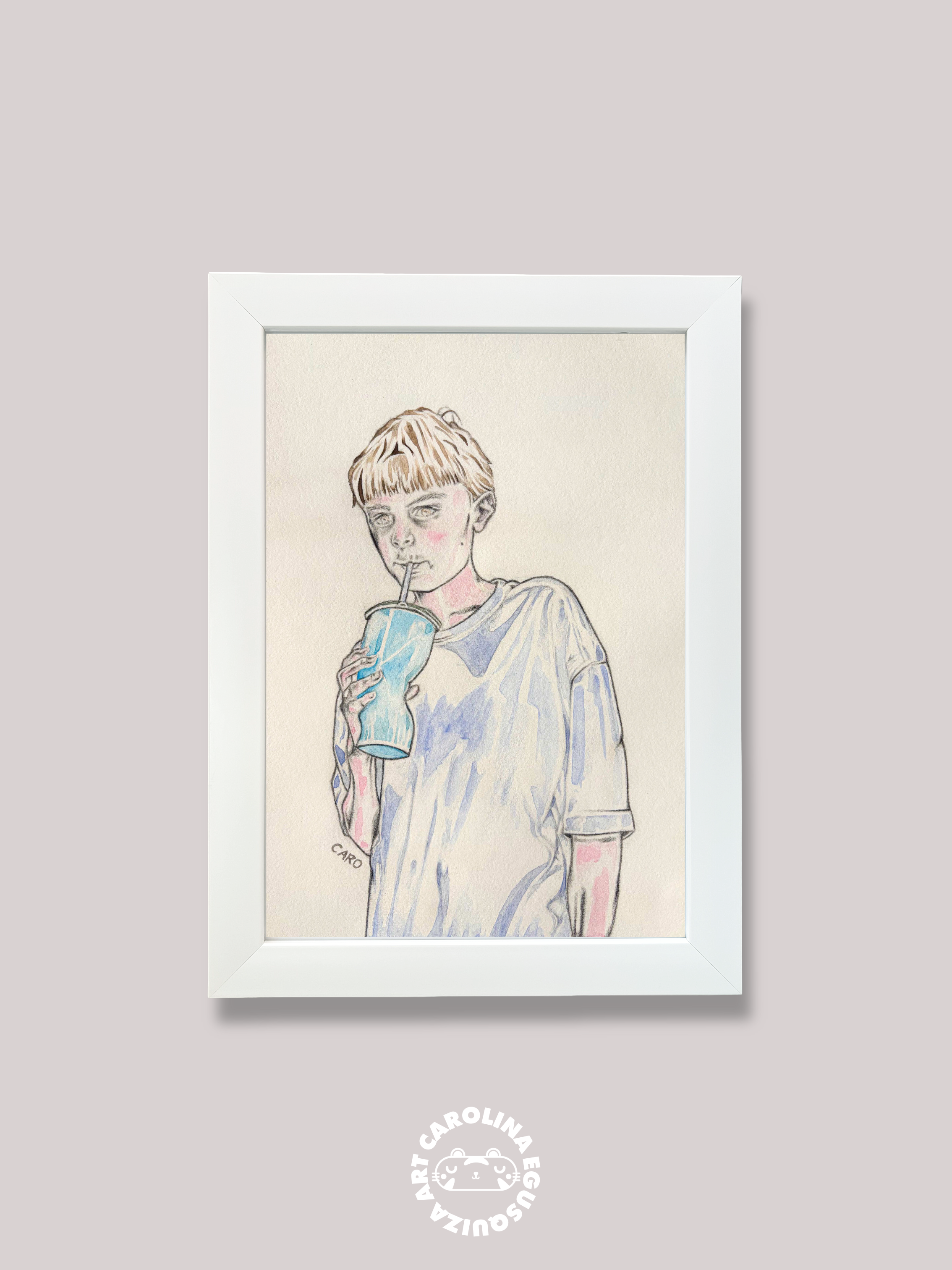 Mixed media portrait work of my nephew Jaye sipping his beverage through a straw. My intention for this drawn piece was to tap into a blend of watercolours and graphite.